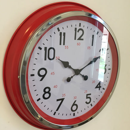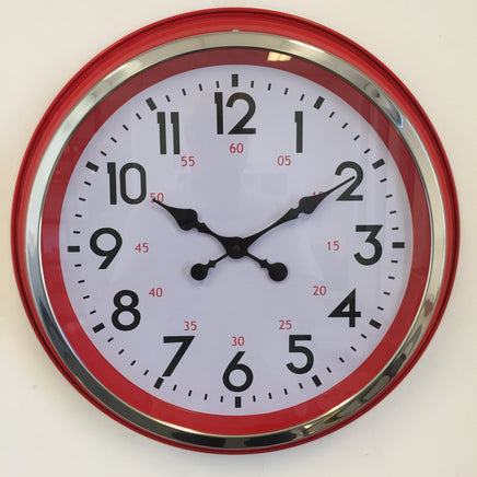 Schitterende XL wandklok in een modern retro uitvoering, geheel van metaal in de kleur rood. De diameter is 50 cm , met duidelijke cijfers en grote wijzers. Met glasplaat afdekking van de wijzerplaat en chroom rand.